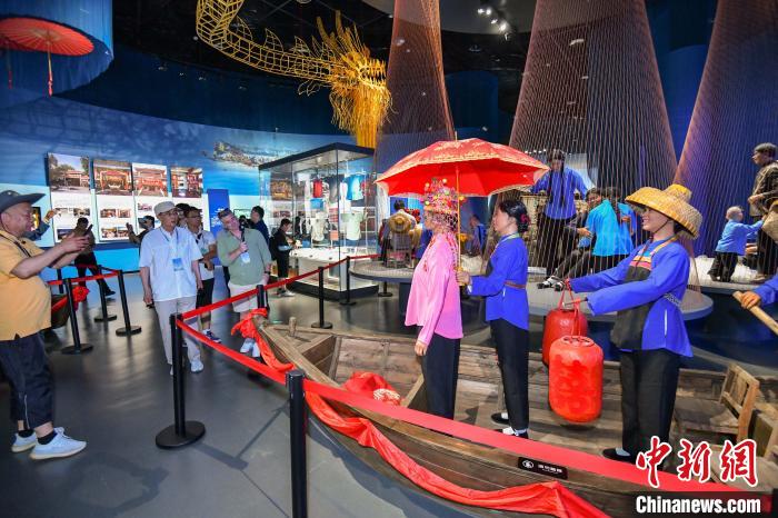 6月8日,海南陵水,在海南疍家博物馆展出的疍家人举行水上婚礼的场景,吸引参观者。中新社记者 骆云飞 摄