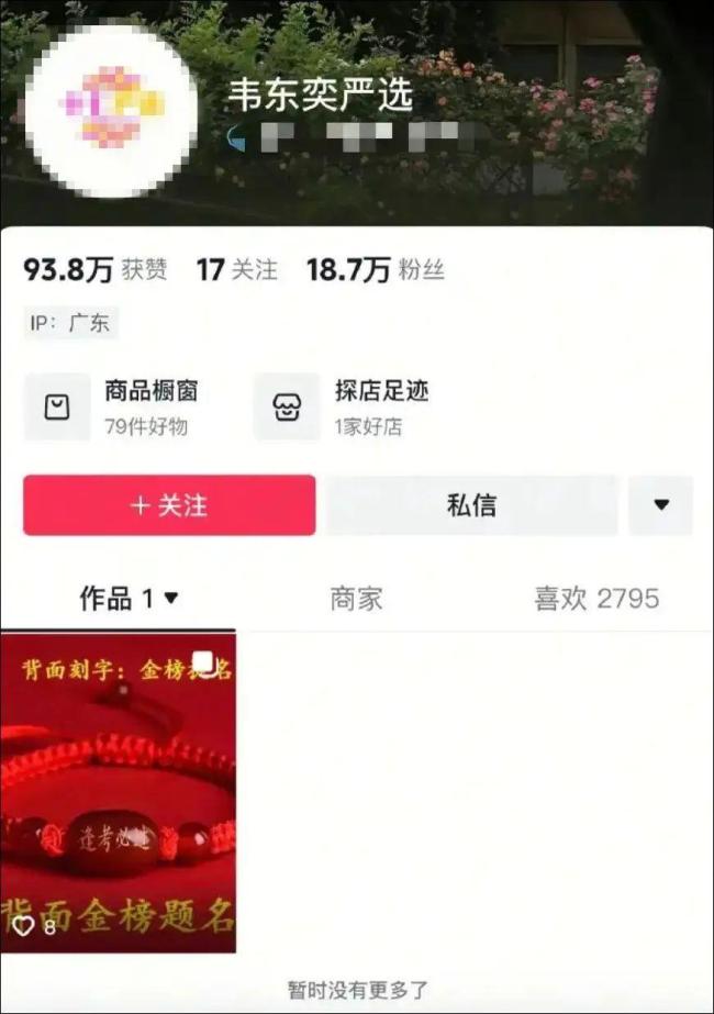 与此同时,短视频平台上出现了多个以“韦东奕严选”“韦神”“韦神女友”等命名的账号,甚至有人使用韦东奕的头像进行带货。其中,“韦东奕严选”拥有18.7万粉丝,在高考首日发布了图文信息,推销9.9元的高考幸运绳。对此,平台客服表示用户可以对该账号进行举报,若确实违规,平台会进行处罚。6月7日晚,“韦东奕严选”更改了账号名称,其他一些同名账号也已搜索不到。