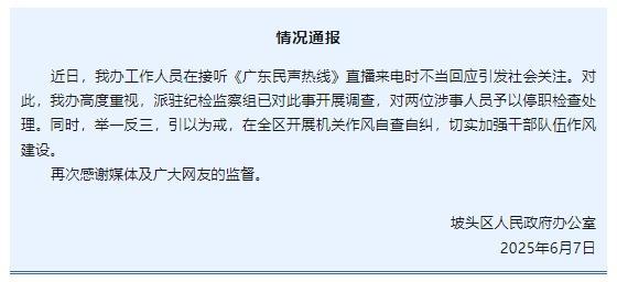 广东省湛江市坡头区人民政府办公室6月7日发布通报,称近日该办公室工作人员在接听《广东民声热线》直播来电时不当回应引发社会关注。对此,区政府高度重视,派驻纪检监察组已对此事开展调查,并对两位涉事人员予以停职检查处理。同时,全区将开展机关作风自查自纠,切实加强干部队伍作风建设。