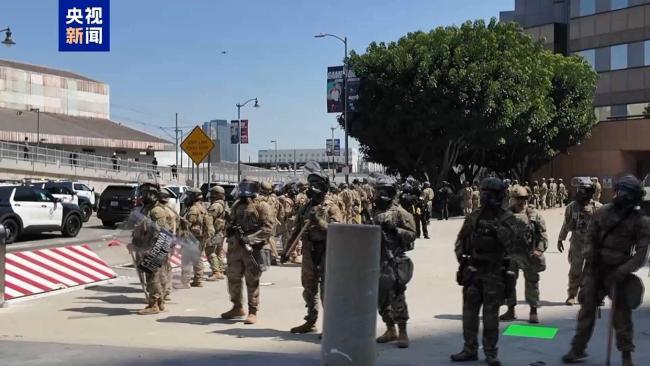 这栋位于洛杉矶市中心的建筑是美国移民与海关执法局的办公场所和临时拘留点,最近几天这里成为骚乱的中心之一。美国国民警卫队已部署在现场,这些荷枪实弹穿着迷彩服的士兵是特朗普政府派遣的。据官方消息,至少300名国民警卫队队员已经抵达洛杉矶。