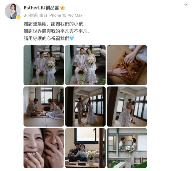 6月9日,中国台湾女演员刘品言宣布与同为演员的连晨翔结婚,并透露已经怀孕。两人在个人社交账号上分享了多张婚纱照,展现了他们的甜蜜。