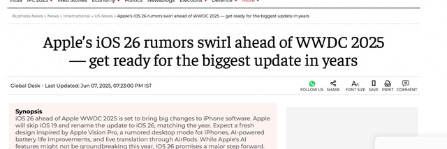最新的消息中最令人震惊的是新的命名方案。苹果计划放弃传统的命名方式,将今年的更新命名为iOS 26,象征着2026年。此举将影响所有苹果平台——macOS、watchOS、tvOS和visionOS也将采用“26”后缀。这使得软件产品线更容易理解,但一开始可能会让一些用户感到困惑。尽管如此,这是一个全新的开始,也预示着苹果已准备好进行重大变革。