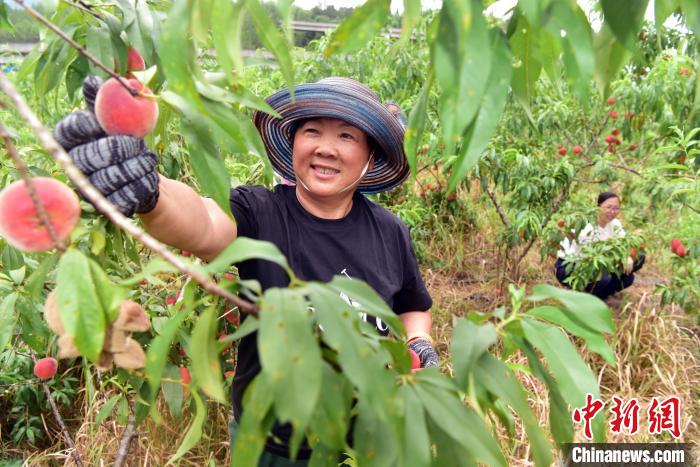 图为卢月香采摘桃子。中新社记者 张丽君 摄