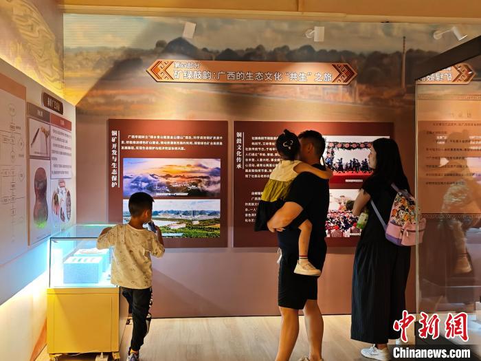 中新网南宁6月11日电(杨陈 张万方)6月11日,“八桂铜辉:穿越时空的铜鼓与铜矿传奇”临时展览在广西自然资源博物馆开展。现场展出30余件/套来自广西、福建,以及美国、墨西哥、老挝、刚果(金)、纳米比亚的国内外矿石等展品,吸引了广大观众前来领略数千年铜文化的独特韵味。