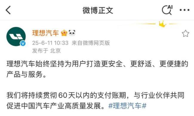 理想将持续贯彻60天以内的支付账期 促进汽车产业高质量发展