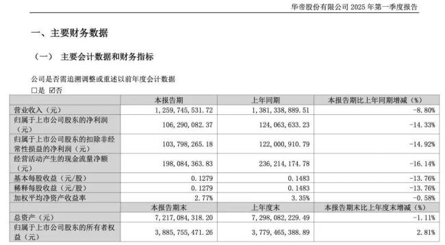 财报数据显示,今年一季度华帝股份营收12.60亿元,同比减少8.80%;归属于上市公司股东的净利润1.06亿元,同比减少14.33%。这是华帝股份在近10期披露的财报中,首次出现业绩下滑;也是华帝股份近5年来,首次一季报业绩下滑,而且是营业收入和净利润的双下滑。