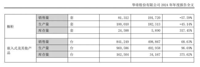 年报数据显示,2024年,华帝的吸油烟机销售量253.7万台,同比增长7.22%,虽增长但未能跑赢行业;而灶具、消毒柜、橱柜三大业务更是全面下滑,其中消毒柜销量同比暴跌18.96%,下滑最明显的橱柜产品更是出现57.59%的销量暴跌。