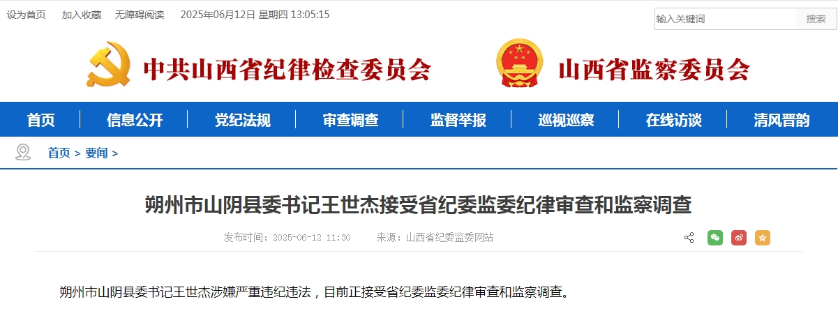 中新网6月12日电 据山西省纪委监委网站消息,朔州市山阴县委书记王世杰涉嫌严重违纪违法,目前正接受山西省纪委监委纪律审查和监察调查。