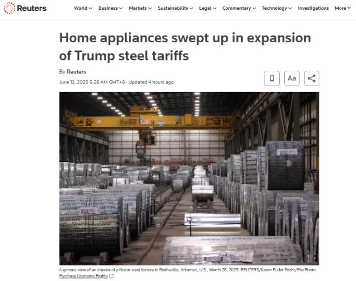 中新网6月13日电(宫宏宇)据路透社报道,当地时间6月12日,美国商务部宣布将自6月23日起对多种钢制家用电器加征关税,包括洗碗机、洗衣机和冰箱等“钢铁衍生产品”。