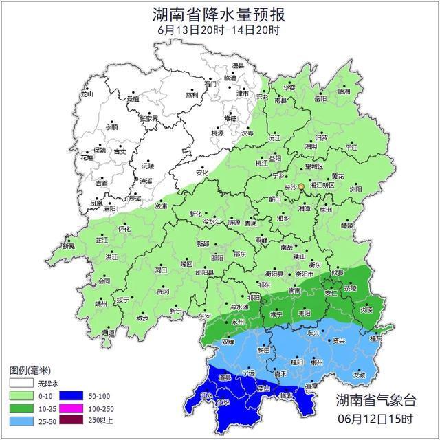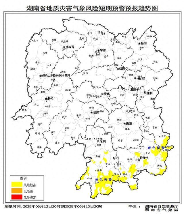 根据地质灾害成灾规律和孕灾条件,结合2025年6月12日短期气象预报情况,省自然资源厅与省气象局联合会商得出结论:自6月12日20:00至13日20:00,湘东南、湘南的株洲、郴州、永州等市州山地丘陵区发生突发性地质灾害风险较高,处于黄色预警状态。具体包括株洲市炎陵县多个乡镇,郴州市北湖区南部、桂东县、嘉禾县南部、临武县、汝城县西南部、苏仙区西南部、宜章县、资兴市西南部等多个乡镇,以及永州市道县西部、江华瑶族自治县、江永县西南部、蓝山县、宁远县、双牌县南部等多个乡镇。