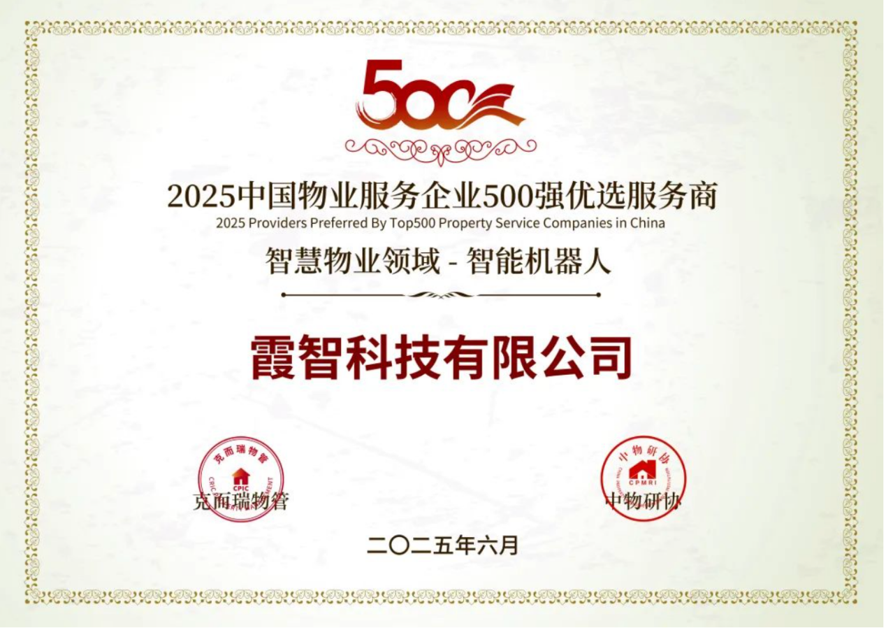 在本次研究成果发布会上,霞智科技凭借其成熟的产品矩阵与广泛的商业落地成果,获评“2025年中国物业服务企业500强优选服务商基础服务领域品牌-智能机器人”,该奖项由主办方通过对全国多家物业企业采购与合作满意度调研评选产生,代表了物业服务行业对智能化清洁技术供应商的高度认可。
