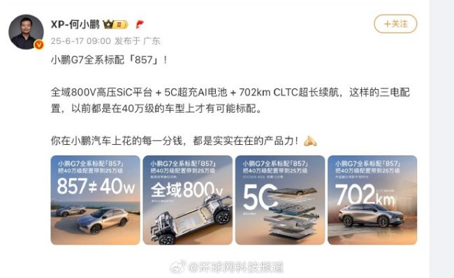 小鹏G7同级唯一标配857 重新定义B级SUV三电标准。何小鹏确认了,小鹏G7将成为同级唯一标配857配置的车型。这意味着小鹏G7将配备全域800V高压SiC平台、5C超充AI电池以及702km CLTC超长续航。这种配置通常只出现在40万以上的纯电车型中,且不一定作为标配。小鹏G7则直接将这些高端配置带到了25万的价格区间,重新定义了B级SUV市场的三电起步标准。