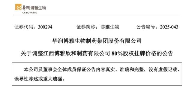 挂牌两次仍无意向方摘牌,华润博雅生物再次调整江西博雅欣和80%股权挂牌价格。