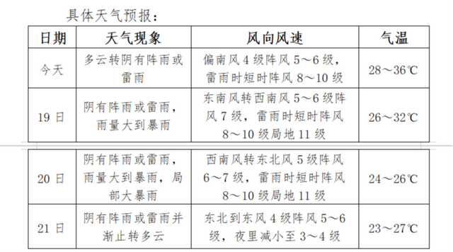 今天后半夜降雨开始,19日至20日阴有阵雨或雷雨,雨量大到暴雨,部分地区可达大暴雨。较强降水时段在19日夜里至20日白天,过程累计雨量80~150毫米,局部可达200毫米以上。降雨期间部分地区伴有雷电、小时雨强50~80毫米的短时强降水、8~10级局地11级雷暴大风等强对流天气。21日白天降雨停止。