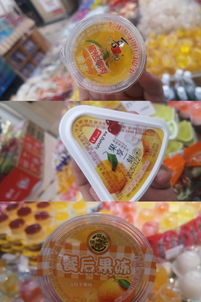 除了冰品外,果冻也是含有合成色素的“重灾区”。徐福记的餐后果冻含桔子果肉的一款产品含有柠檬黄;喜之郎的蜜桔果肉果冻含有柠檬黄和落日黄;马大姐果享一刻黄桃果味果冻含有日落黄、柠檬黄。