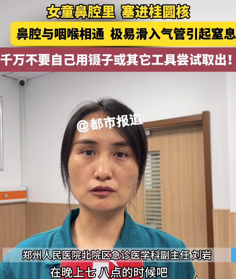 6月19日河南。女童不慎将一颗黄豆大小的桂圆核塞入鼻腔,被紧急送医后,异物被顺利取出。医生特别提醒:遇到类似情况,家长切勿慌乱,切忌自行使用镊子或其他工具尝试取出!应首先安抚孩子情绪,教孩子持续用嘴呼吸,并尽量让孩子保持安静。由于鼻腔和咽喉相通,若异物位置较深,孩子在哭闹、咳嗽或体位改变时,异物可能滑入气管,造成气道梗阻甚至窒息。