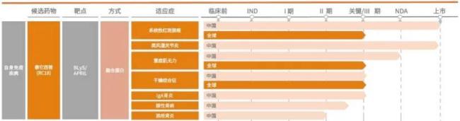 2021年3月,泰它西普首个适应症即系统性红斑狼疮适应症获得国家药监局批准在国内上市销售,同年年底进入国家医保药品目录。2024年7月,泰它西普国内获批类风湿关节炎适应症。2025年5月,泰它西普拿下第三项适应症重症肌无力。此外,泰它西普的视神经脊髓炎谱系疾病、IgA肾病、原发性干燥综合征等适应症的开发皆已处于Ⅲ期临床研究阶段。