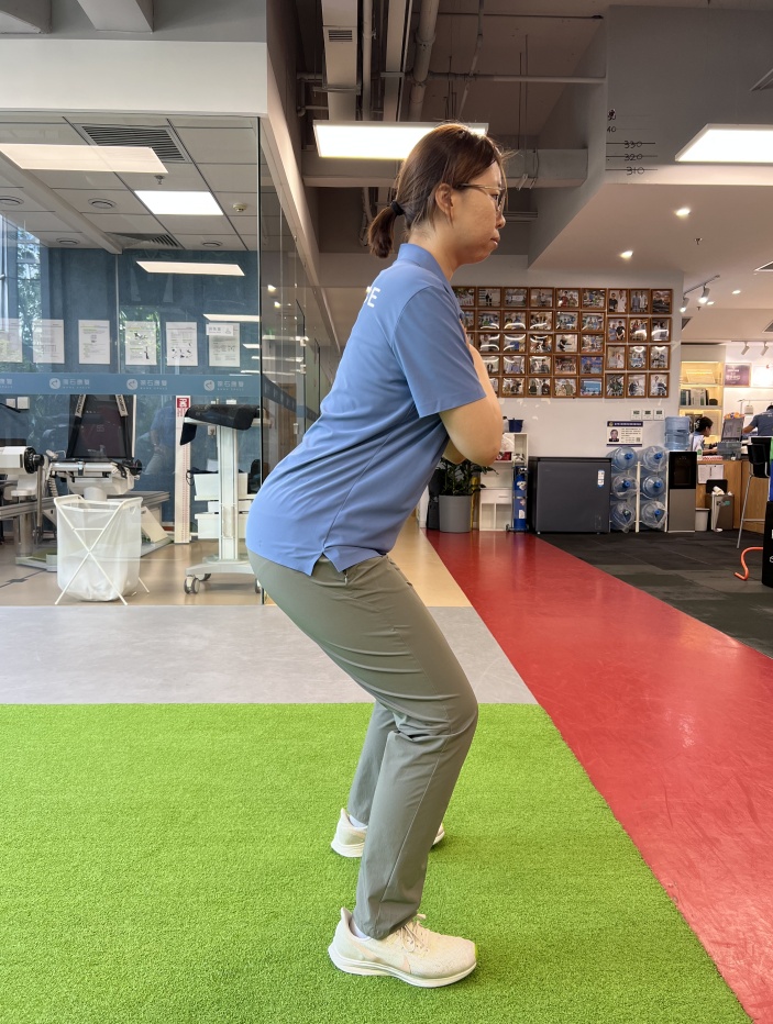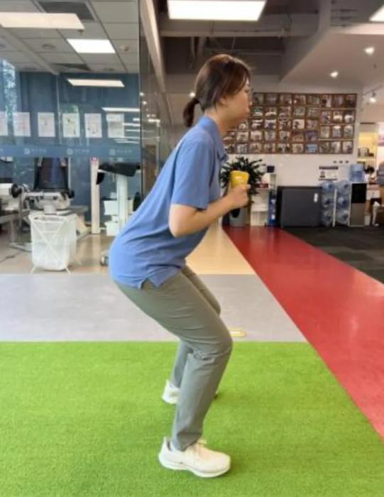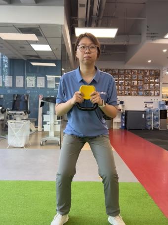 在无痛的范围内缓慢地蹲起,8~12次/组,每天3~5组。后续随着肌力的增长,我们可以在胸前抱一个壶铃来增加难度。