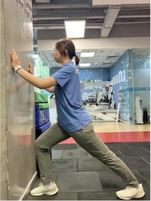 站在墙面前,双手推墙,弓箭步站立,需要牵拉的一侧在后。这时能感觉到自己小腿后部被拉紧,在最极致的位置保持30秒~1分钟。
