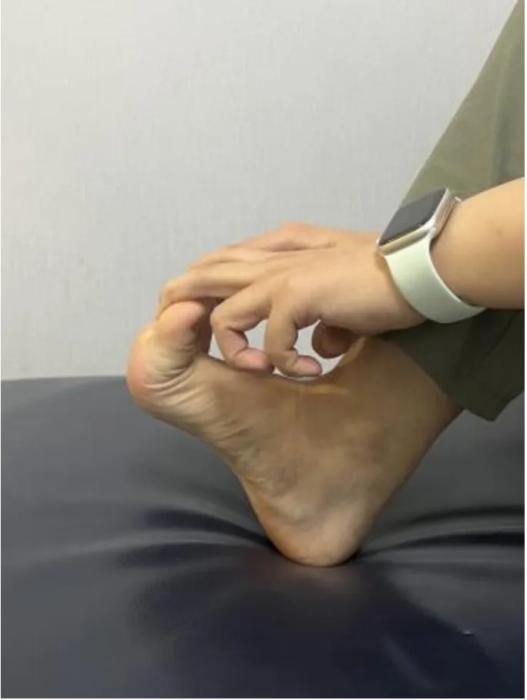 做这个动作一开始有些人会有足底抽筋的感觉,这时候需要自己或让别人帮忙,将几个脚趾反方向向上牵拉即可。