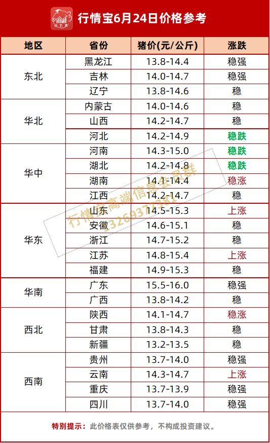 今日全国生猪价格整体上涨,局地小幅弱跌调整。全国21个省份均价上涨,2个省份均价下跌,其它省份均价持稳。均价最低省份为新疆,外三元生猪均价为13.33元/公斤;均价最高省份为广东,外三元生猪均价为15.70元/公斤。河北、广东猪价涨幅最大,环比上涨0.2元/公斤。
