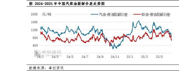 近期裂解价差方面,汽柴油裂解价差持续走弱延续此前跌势。近期汽油裂解价差连续下行,且跌势较为明显,通过数据分析,汽油裂解价差跌破千元关口且持续位于下方波动,汽油裂解价差弱势运行。截至6月19日收盘,国内汽油裂解价差跌至848.33元/吨,相比前一周的周四下跌幅度在208元/吨。柴油裂解价差震荡下行为主裂解近期表现低迷,截至6月19日收盘,国内柴油裂解价差跌至656.86元/吨,相比前一周的周四下跌幅度在290元/吨,随着汽柴油裂解价差双双走弱,为缓解炼油利润下行的局面,炼厂推涨裂解意向较高,对汽柴油市场上涨带来支撑。