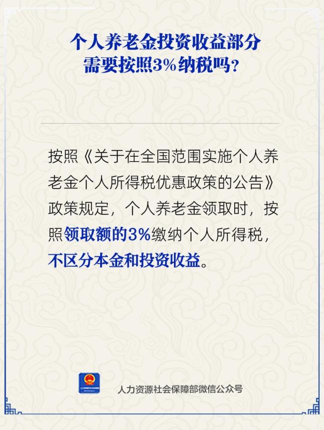 在中国境内参加城镇职工基本养老保险或城乡居民基本养老保险的劳动者,都可以参与个人养老金制度。缴纳个人养老金后,不仅能抵扣个税,账户内的资金还能用于购买符合规定的投资产品。关于个人养老金投资收益部分是否需按3%纳税的问题,人社部表示,在领取个人养老金时,将按照领取额的3%缴纳个人所得税,不区分本金和投资收益。