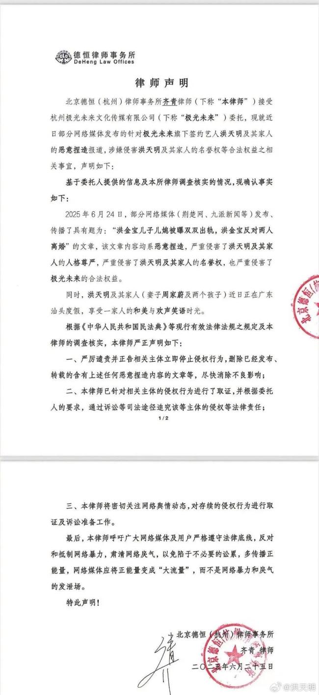 6月25日,洪金宝的长子洪天明发布律师声明,否认了有关他出轨的传闻。他表示,近期一些不实的谣言对他及家人造成了严重影响,并强调网络并非法外之地,将对恶意捏造者追究法律责任。