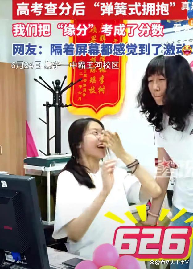 俩好友高考查分后惊叫起拥抱。6月24日,内蒙古集宁一中霸王河校区。两女生相继查分626分和627分,后“弹簧式拥抱”,她们把“缘分”考成了分数,网友:隔着屏幕都感觉到了激动!视频中,两位女生坐在沙发上,紧张又期待地点开了高考成绩查询页面。随着分数的逐渐显现,他们的表情也从紧张转为惊喜。开始查到一位女生成绩是626分!紧接着,另一位女生的分数也揭晓了——627分!两人瞬间激动得从沙发上弹了起来,相互拥抱在一起,仿佛是弹簧一样,弹起又落下,反复了几次。这个画面充满了青春的活力和纯粹的喜悦,让人隔着屏幕都能感受到他们的激动和兴奋。网友们纷纷留言评论:“隔着屏幕都感觉到了激动!”“这才是真正的友谊,一起努力,一起收获!”“看到他们的拥抱,我也想起了自己的高考时光。”这段视频不仅展现了两位好友的高考瞬间,更传递了青春的美好和友谊的力量。