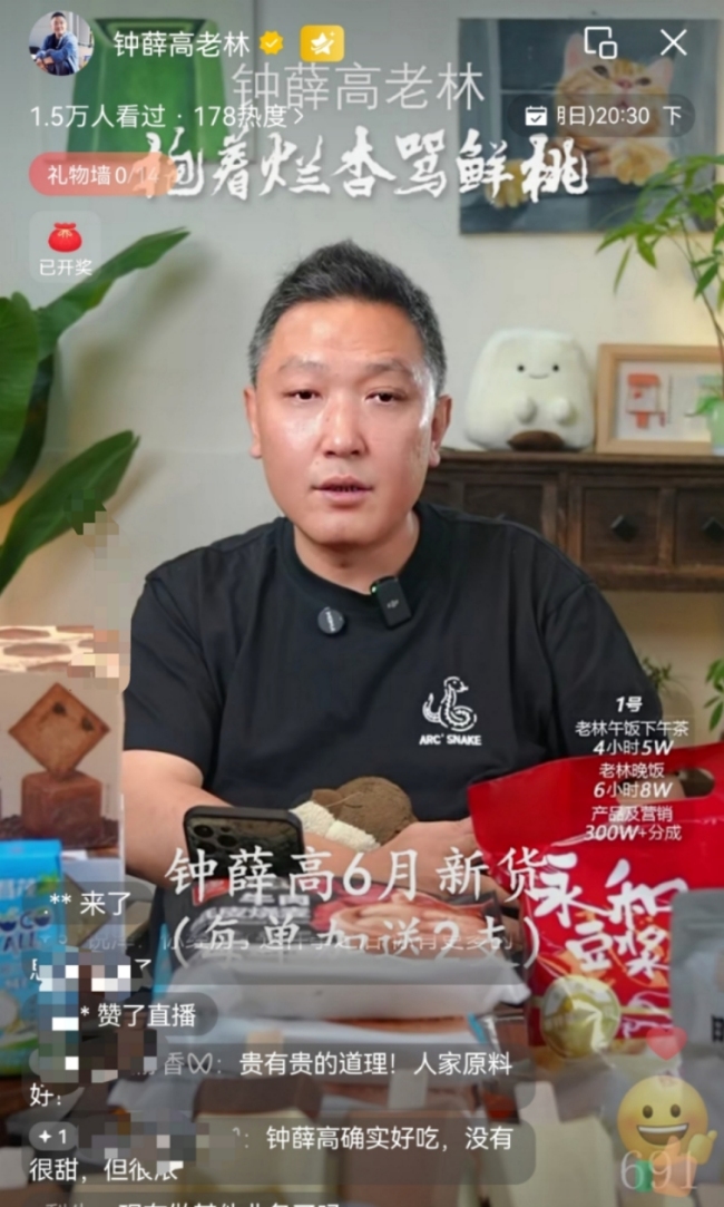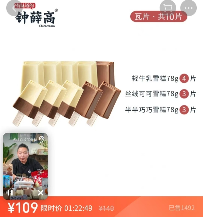 有网友在直播间表示,“在线下看不到钟薛高的产品”。林盛表示,可以在直播间里购买。