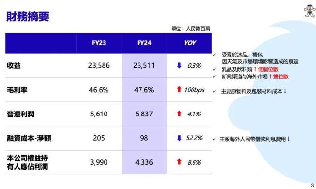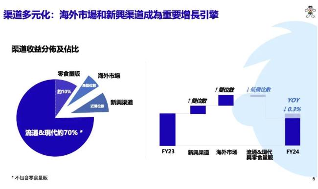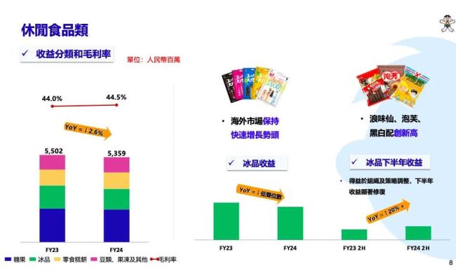 后来通过积极应对市场变化,并在下半财年进行内部组织挑战,按产品分设事业部,强化了各个渠道协同,统筹海内外运营发展。通过此举,中国旺旺2024财年下半年收益与去年同期比恢复低个位数成长,其中乳品及饮料类实现中个位数增长,冰品小类表现亮眼实现超2成恢复性增长。此外,新兴渠道如OEM及海外市场持续发力,2024财年收益同比均增长双位数,仍是集团增长的重要动力。