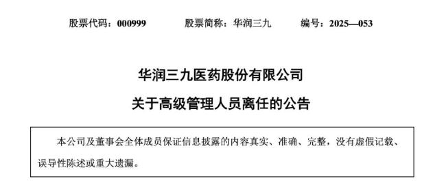6月24日,华润三九发布公告,黄先锋由于工作调整原因辞去副总裁一职,辞职后继续在华润三九担任党委专职副书记职务。