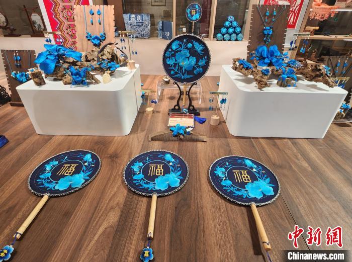 馆内展示团扇、耳环等苗绣手工艺品。赵晓 摄