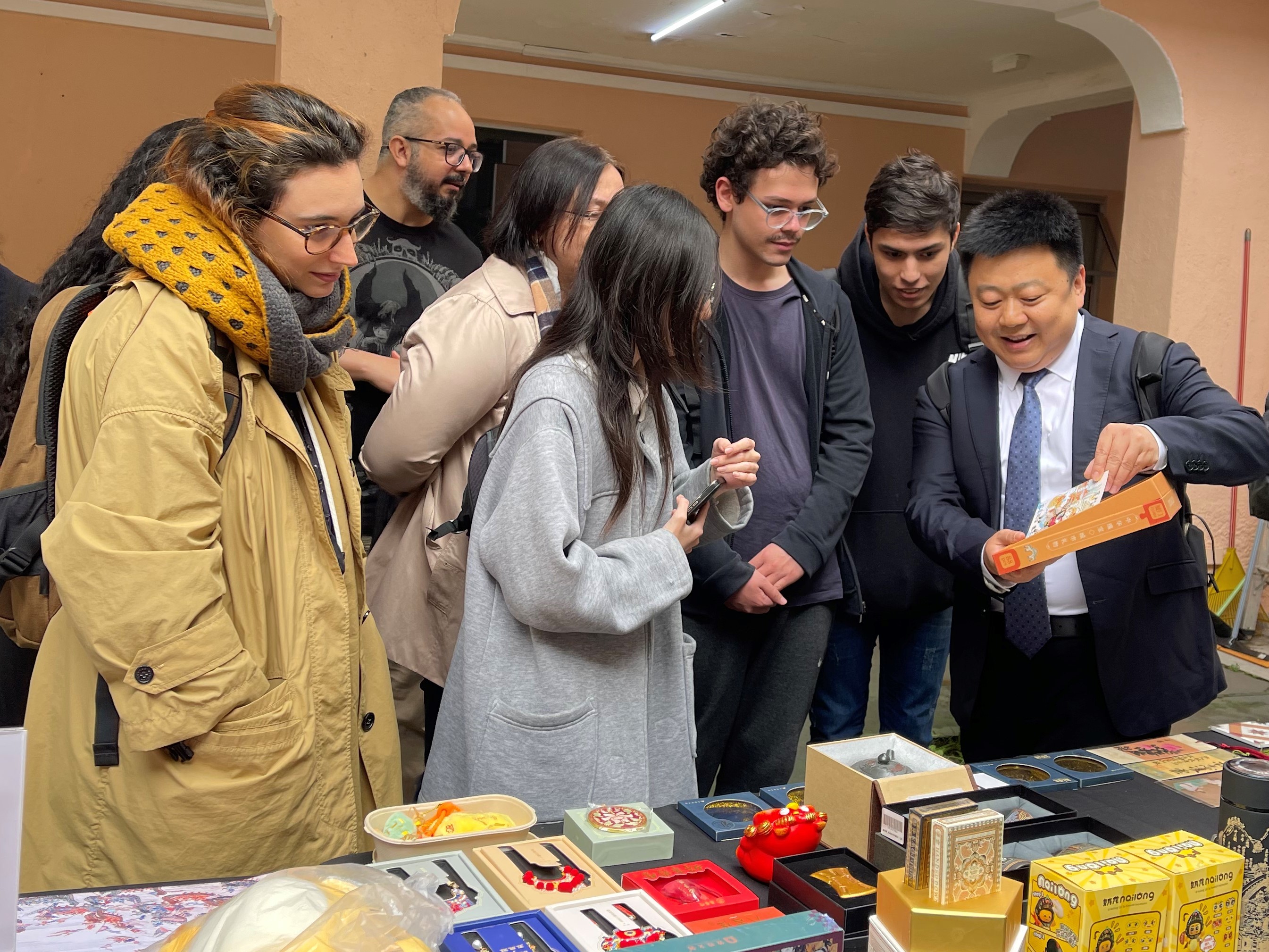 第三届拉美中国文化巡回展·走进巴西活动现场,工作人员向参观者介绍文创产品。厦门外图集团供图