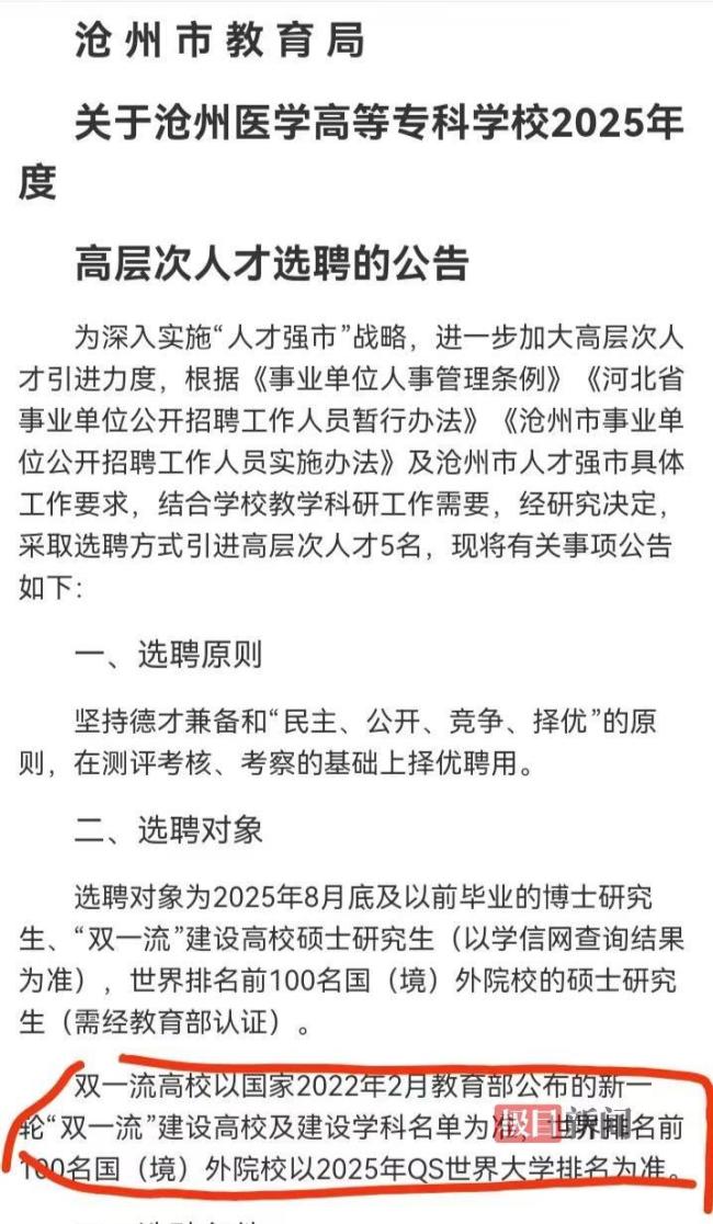 去年底,沧州医学高等专科学校发布了《2025年度高层次人才选聘公告》,选聘对象包括2025年8月底及以前毕业的博士研究生、“双一流”建设高校硕士研究生,以及世界排名前100名国(境)外院校的硕士研究生。其中,“双一流”高校以2022年2月教育部公布的新一轮“双一流”建设高校及建设学科名单为准;世界排名前100名国(境)外院校以2025年QS世界大学排名为准。