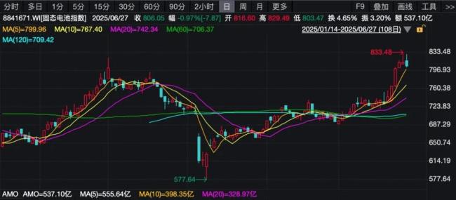 复盘来看,去年以来,A股市场固态电池板块已走出4波大行情,最新一轮起始于“关税劫”后的4月9日,到6月26日盘中高点,固态电池指数最大涨幅已超过44%,大幅跑赢大盘同期12.79%的涨幅;加速拉升则在6月20日之后,多只概念股气势如虹,走出连板行情。