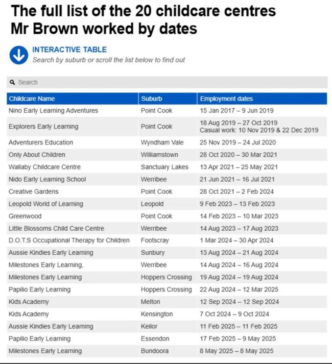 布朗被控涉及儿童强奸、性侵以及制作和散播儿童虐待材料等罪行。目前他尚未对指控提出抗辩,被还押候审,预计将于9月在墨尔本地方法院出庭。当局表示,布朗持有有效的儿童工作证,并在被捕时仍是托儿所工作人员。警方透露布朗没有案底,并相信其为单独作案,且相关罪行仅发生于维多利亚州。