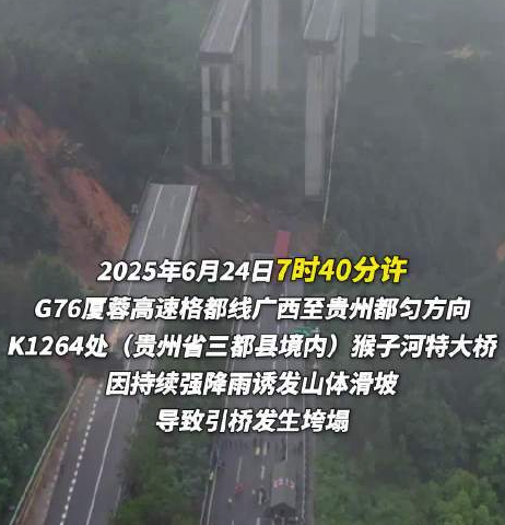 近日,G76厦蓉高速格都线猴子河特大桥因持续强降雨诱发山体滑坡,导致引桥发生垮塌。危急时刻,200多辆车被提前拦下。