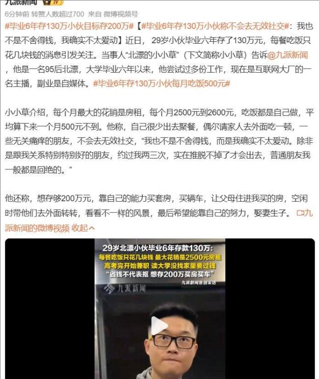 毕业6年存130万小伙每月吃饭500元。