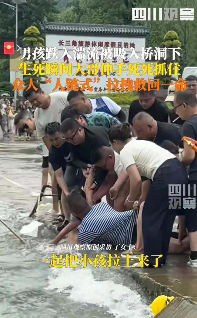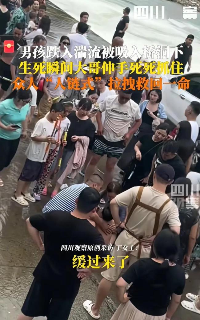 男孩坠入河中险被冲走 路人接力救援 生死两分半的拉锯战