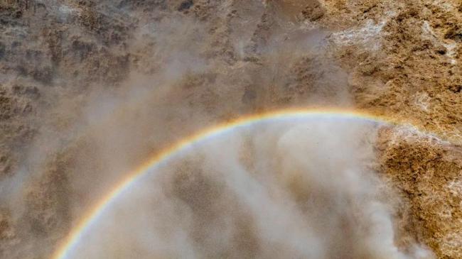 黄河水犹如一条黄色的巨龙,裹挟着雷霆万钧之势,自秦晋大峡谷间奔涌而来,山岩与激流碰撞,苍翠与金黄交织,绘就一幅磅礴的夏日画卷。河水撞击瀑布底部岩石,飞溅的珠玉在半空凝成细密水雾,在骄阳下折射出七彩光晕,横跨于瀑布之上,以排山倒海之势撕裂苍穹,为这雄浑壮阔的景致注入磅礴气韵。
