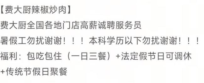 此前,有网友分享了“费大厨辣椒炒肉”深圳一门店招聘服务员的信息。该职位薪资范围在5000-6000元/月,提供包吃包住福利,工作内容包括做好桌椅、餐厅卫生和摆台,接待顾客时需主动热情。招聘信息中特别备注“暑假工勿扰”“本科学历以下勿扰”,引发网友热议。