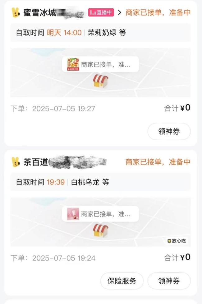 这波订单激增与美团外卖的大额补贴有关。社交平台反馈显示,不少网友发现美团在7月5日投放了大量“0元购”外卖红包券,领取后可以免费获得奶茶、汉堡等,选择外送需满一定额度并支付配送费,选择到店自取则完全免费。这番力度颇大的折扣导致全国范围内外卖订单数量激增,不少消费者在网上晒出自己冰箱里囤满蜜雪冰城、茶百道等照片,感慨“实在是喝不下了”。