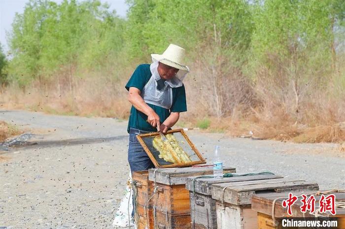 “蜜蜂不但能酿造出肉苁蓉花蜜,还可以给肉苁蓉授粉,提高产量。”正在查看蜂箱的养殖户寇新军说,以前,这里风沙大得眼睛都睁不开,现在蜜蜂都舍不得离开。