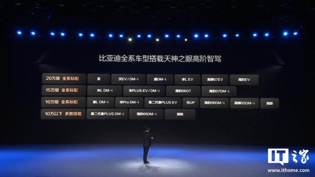 在今年2月的“天神之眼开创全民智驾时代”智能化战略发布会上,比亚迪集团总裁王传福表示,比亚迪全系车型都将搭载高阶智驾系统。首批21款车型涵盖了各个价位段,包括汉、唐、宋、海豹、海狮、海豚、海鸥等车系和车型。