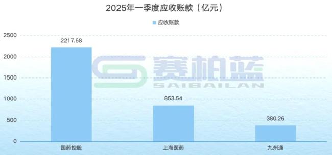 应收账款中,国药控股达到最高(2217.68亿元),其次是上海医药(853.54亿元)、九州通(380.26亿元)。