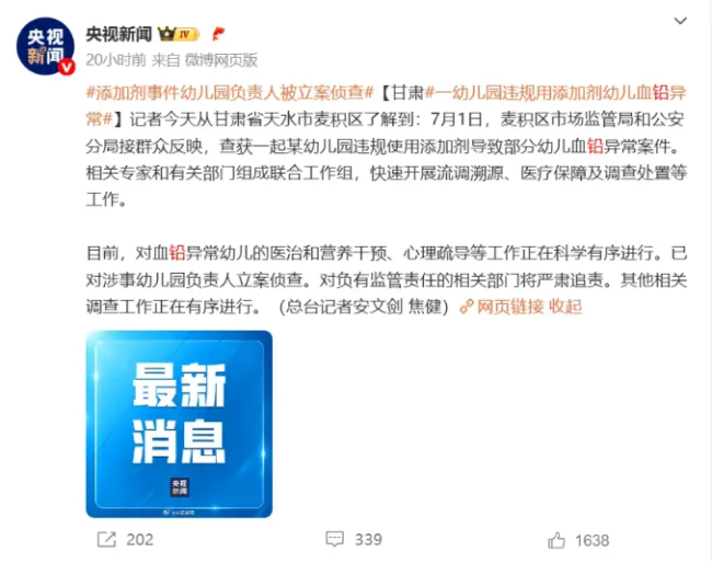 甘肃天水麦积区幼儿园血铅事件近日持续引发广泛关注。央视新闻7月3日报道,涉事幼儿园已被立案调查,后续消息显示,已有19名患儿被转送外地治疗,同时超过200份样本被送往甘肃省疾控中心复检。事件的发酵,也让“血铅超标”这一问题再次走入公众视野。