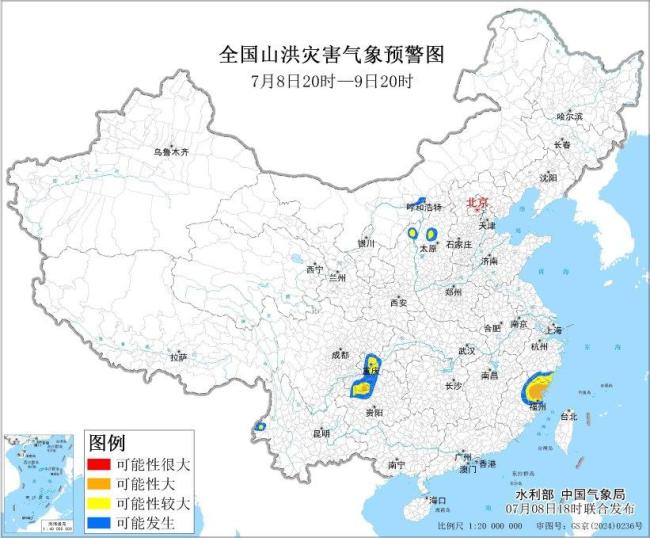 水利部和中国气象局7月8日18时联合发布橙色山洪灾害气象预警。预计,7月8日20时至9日20时,山西北部、浙江南部、福建东北部、四川东南部、重庆西南部、贵州西北部、云南东北部和西部、陕西北部等地部分地区发生山洪灾害可能性较大(黄色预警),其中,福建东北部、四川东南部、贵州西北部等地部分地区发生山洪灾害可能性大(橙色预警)。其他地区也可能因局地短历时强降水引发山洪灾害,各地需注意做好实时监测、防汛预警和转移避险等防范工作。