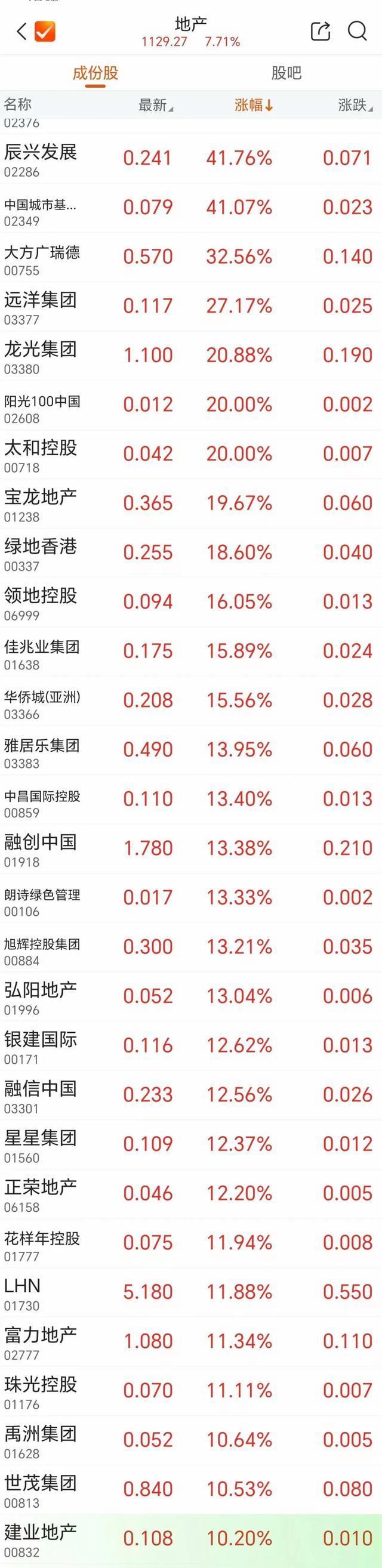 分析师:更猛的楼市刺激政策要来了 股市房市齐上涨!A股和港股的房地产板块突然大幅上涨,带动了相关行业如银行、保险、钢铁、建筑、建材等板块的表现。在A股中,房地产板块整体上涨了3.59%,位居第一。港股房地产板块涨幅更是达到了7%,部分个股甚至上涨超过20%。