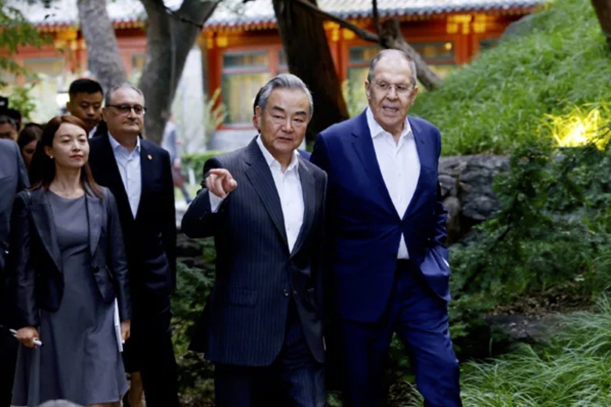 7月13日,王毅在钓鱼台国宾馆会见了拉夫罗夫,现场气氛十分融洽,两人先是在充满中式风格的庭院凉亭中茶叙交流,随后中方设宴招待了拉夫罗夫,双方在工作晚宴上继续“深入磋商”。